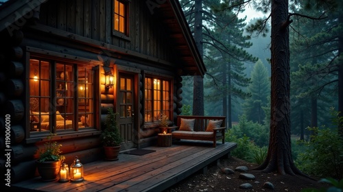 © Urenus Photos, Obraz premium Rustic Cabin Retreat Illuminated by Warm Evening Light in a Serene Forest Setting