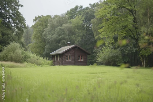 Fototapeta premium Rustic cabin surrounded by greenery, suitable for rural landscape or outdoor adventure concepts