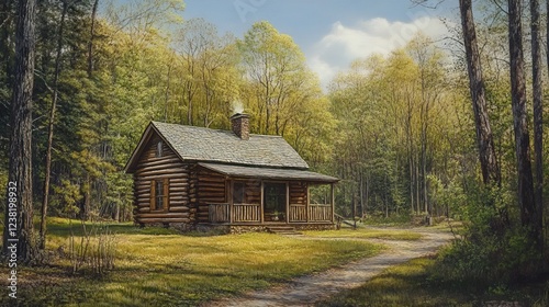 © Javid, Obraz premium Rustic Cabins Surrounded by Blooming Forest in Spring. AI generated image