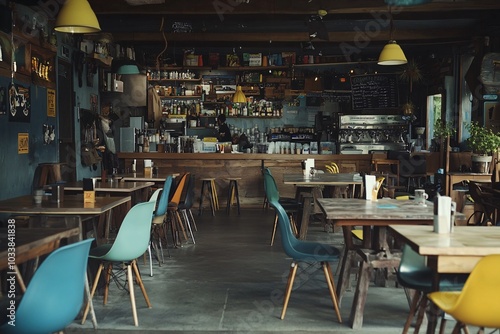 Obraz premium Rustic Cafe Interior with Wooden Tables and Vintage Chairs