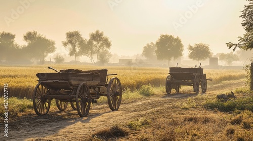 Obraz premium Rustic Carts on Country Road Amid Golden Rice Fields at Sunrise