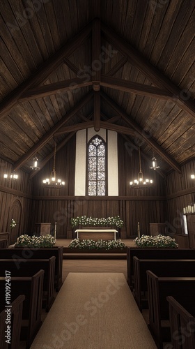 Fototapeta premium Rustic Chapel Interior with Floral Decorations and Wooden Beams for Serene Celebrations