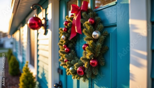 © Stanislav, Fototapeta premium Rustic Christmas Wreath close-up in natural tones representing holiday decoration against a blurred colourful street