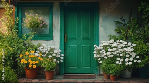 Fototapeta premium Rustic cottage entrance with vibrant flowers