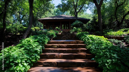 Fototapeta premium Rustic cottage in lush green forest with stone staircase pathway and vibrant...