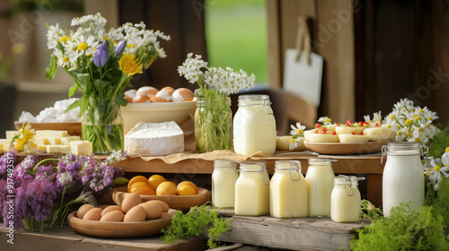 Fototapeta premium Rustic Countryside Dairy Display with Fresh Eggs Cheese and Milk Outdoors
