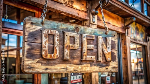 Fototapeta premium Rustic, distressed, and ornate, an old-fashioned open sign hangs crookedly from a vintage storefront, its faded letters and worn wood evoking a bygone era's charm.