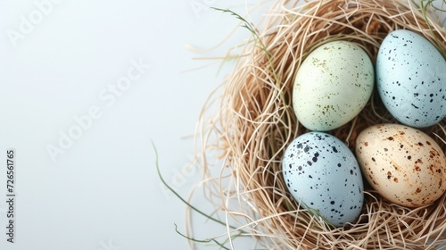 © wikkie, Obraz premium Rustic Easter eggs in nest on white background. Copy space for text. generative AI