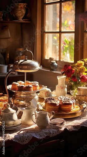 Naklejka premium Rustic Elegance: Vintage Teapots and Fresh Pastries in a Cozy Country...
