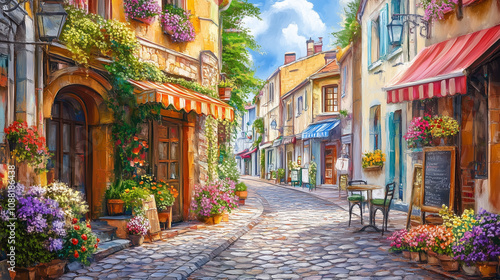 Fototapeta premium Rustic European street with cobblestones, vintage cafés, and colorful flowers...