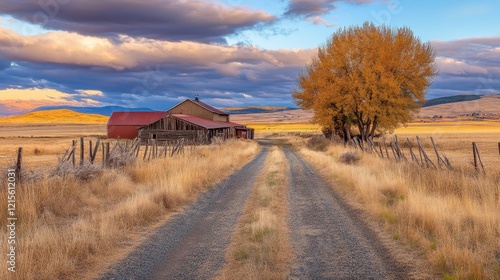 Fototapeta premium Rustic Farm Building Autumn Landscape Road Scene