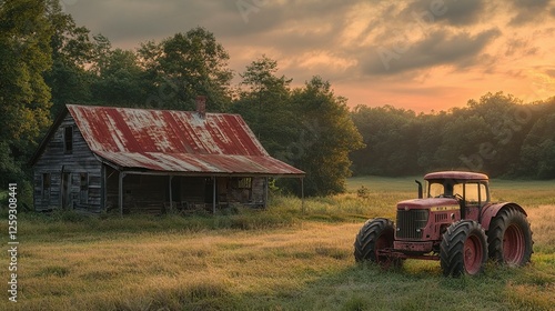 © aishale, Fototapeta premium Rustic Farmhouse and Tractor at Sunrise