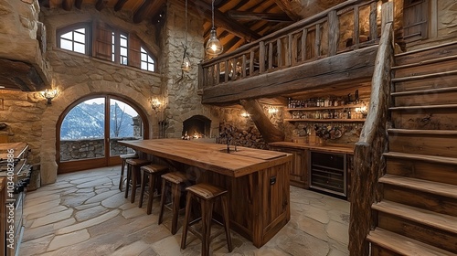 © Sopacha, Obraz premium Rustic farmhouse kitchen with a wooden island and vintage stools