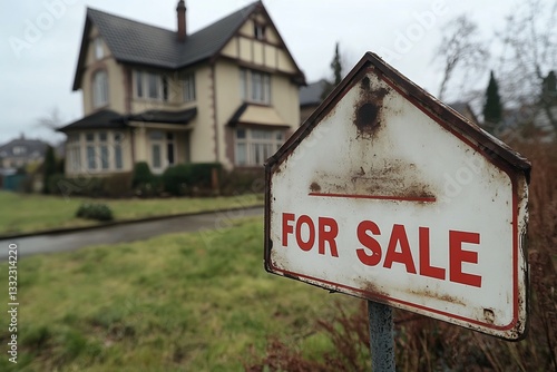 © moon_, Obraz premium Rustic For Sale Sign in Front of a House