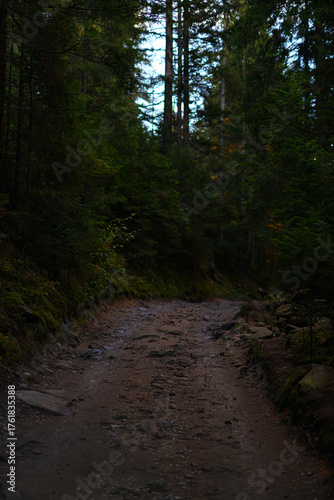 © Andrii Zastrozhnov, Obraz premium Rustic forest pathway through dense woods under dim light