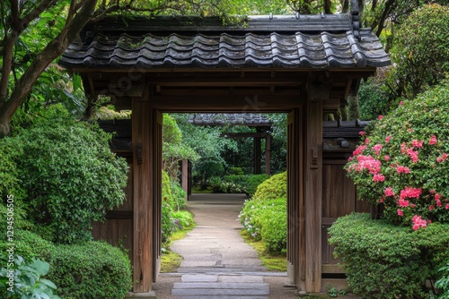 Obraz premium Rustic Garden Gate Framed by Flowering Bushes in a Lush Landscape Serene...