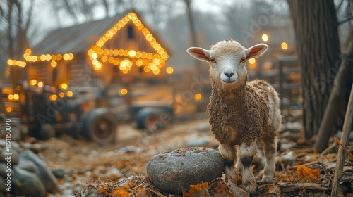 Obraz premium Rustic Goat at Barn with Festive Lights. Generative AI