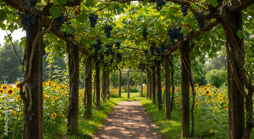 © RAJA, Naklejka premium Rustic Grape Arbor Path Surrounded By Vibrant Sunflowers In Lush Garden
