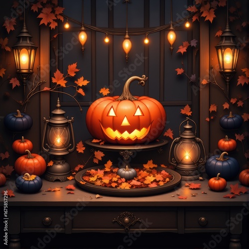 Obraz premium Rustic Halloween Scene With Lantern And Pumpkin