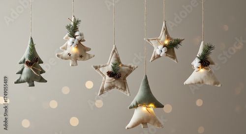 Fototapeta premium Rustic Holiday Decor Fabric Christmas Ornaments with Bokeh Background