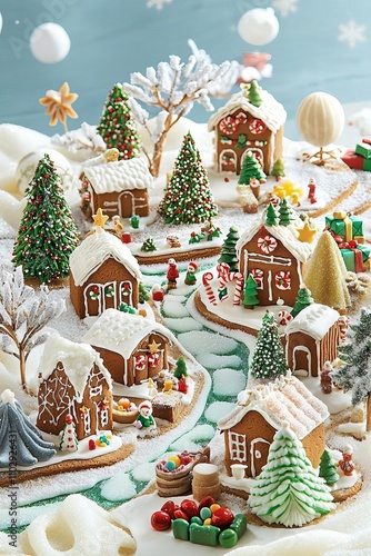 Naklejka premium Rustic holiday village made from gingerbread and candies, Christmas Festival,...