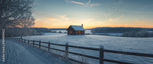 © The 2R Artificiality, Naklejka premium Rustic home with fencing during winter months