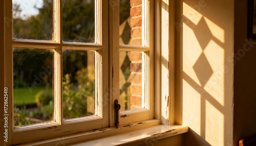 © Fabio, Obraz premium Rustic household window with peeling paint in golden hour sunlight. Geometric shadows on interior wall. View of tranquil garden. Concept of home, nostalgia, peace, coziness.