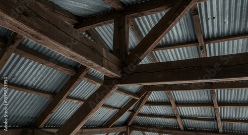 Obraz premium Rustic Interior View Of Weathered Wooden Beams And Corrugated Metal Roof