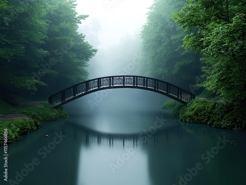 Fototapeta premium Rustic iron bridge crossing a misty river in a forested rural setting, with...