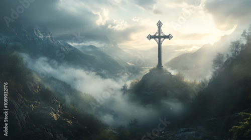 Naklejka premium rustic iron cross rising prominently over tranquil valley, surrounded by misty mountains