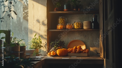 © Oana, Obraz premium Rustic kitchen counter with produce, plants, and canned goods on shelves.