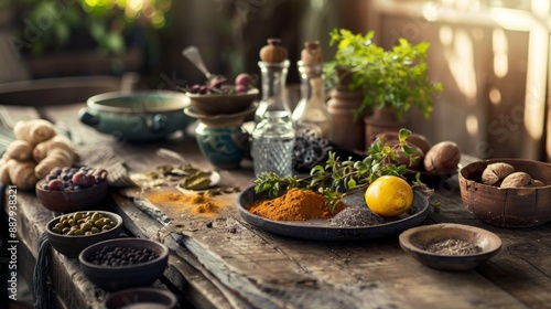 Naklejka premium Rustic kitchen scene with spices, herbs, and fresh ingredients