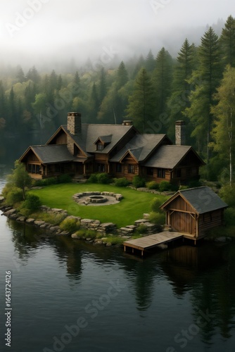 © Mian, Fototapeta premium Rustic Lakeside Log Cabin with Dock and Forest View