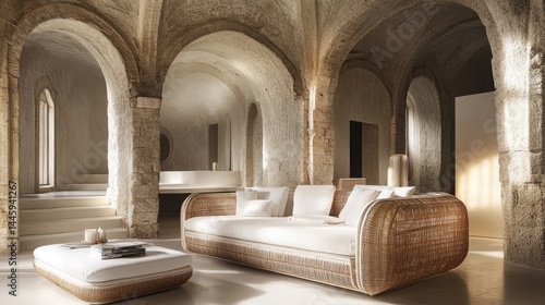 Fototapeta premium Rustic, light-filled living space with a woven rattan sofa.