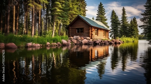 Obraz premium Rustic lodge peaceful lake view
