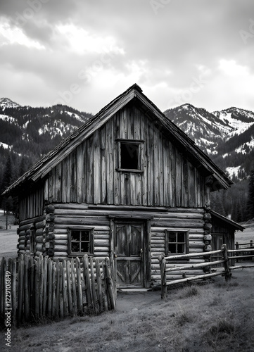 Obraz premium Rustic Log Cabin in Mountain Landscape Black and White Photo