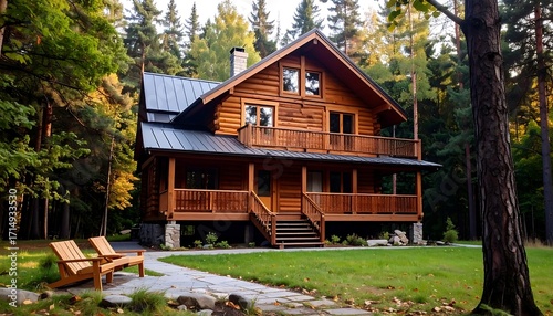 © Junaidi, Fototapeta premium Rustic log cabin nestled in autumn forest