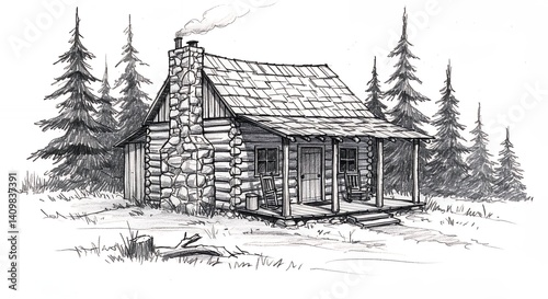© SULIS, Fototapeta premium Rustic log cabin sketch design illustration