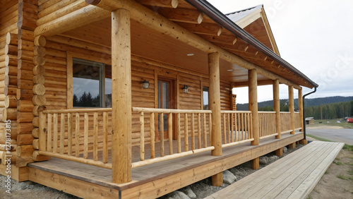 Obraz premium Rustic log cabin with wooden porch and scenic mountain view in serene outdoor...