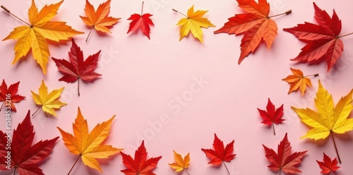 © Lawan, Obraz premium Rustic maple leaves artfully arranged against a delicate pink surface Thanksgiving aesthetic , background image, design, november