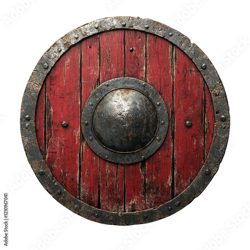 Naklejka premium Rustic Medieval Shield with Red Wood and Dark Metal Centerpiece