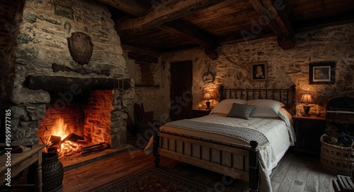© The 2R Artificiality, Fototapeta premium rustic medieval sleeping chamber with active hearth and flickering flames