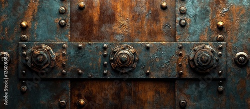 Fototapeta premium Rustic metal door with weathered copper and iron textures, featuring circular...