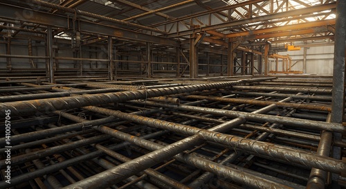 © NguyenHaiPhuong, Fototapeta premium Rustic Metal Grid Structure Warm Light Industrial Setting. AI Generated
