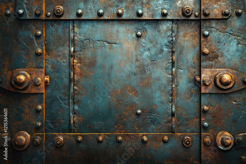 © Vibu design gallery, Fototapeta premium Rustic metal texture with rivets and bolts, showing age and wear.