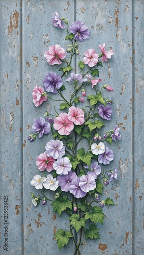 Fototapeta premium Rustic metal wall adorned with blooming sweet pea vines in pastel shades pink purple and white