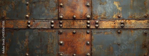 Fototapeta premium Rustic metal wall with rivets, showcasing industrial charm, weathered textures, and rich history in its patina and design