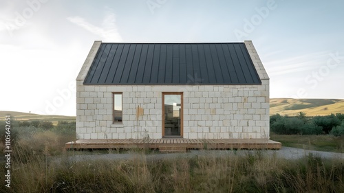 Obraz premium Rustic Minimalist Cabin with Natural Stone Walls in Scenic Landscape