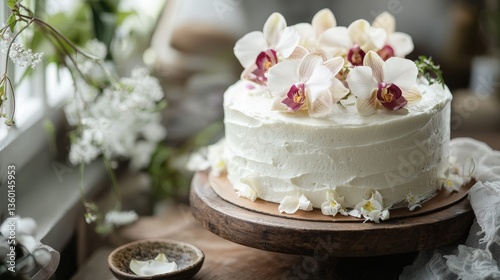 Fototapeta premium Rustic Minimalist Cake with Edible Orchid Flowers on Deep Ceramic Cake Stand...