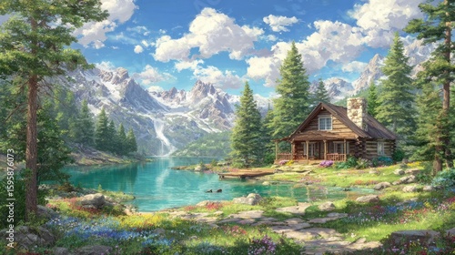 Fototapeta premium Rustic Mountain Cabin By Turquoise Lake With Lush Forest